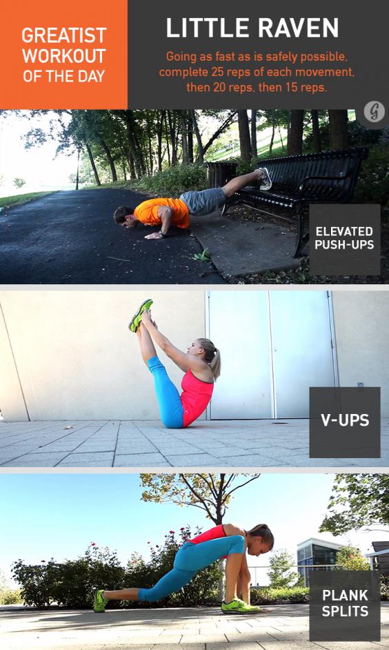 This series of GWODs was designed exclusively for Greatist by Bodeefit. For more information about the exercises in this workout, or to see video demos of each movement, follow the links below the graphic. Be sure to note the results of your workout so you can track your progress as you go.